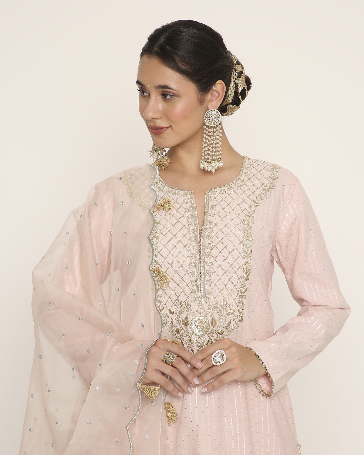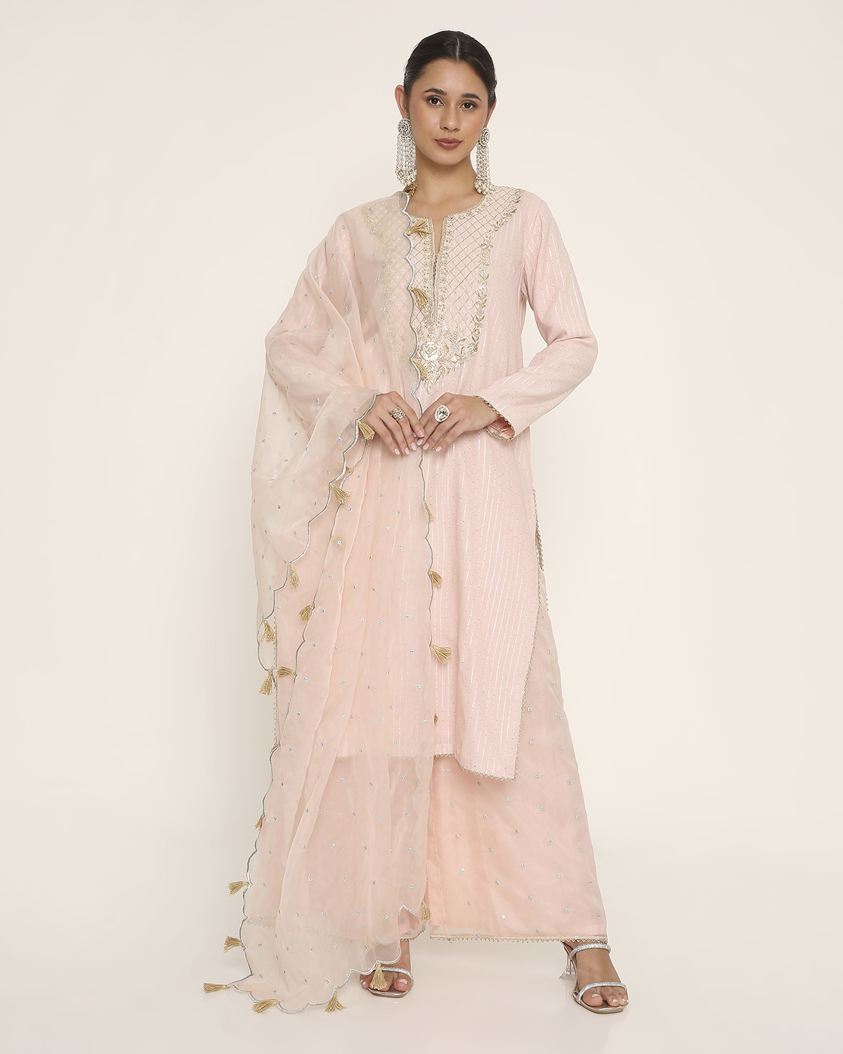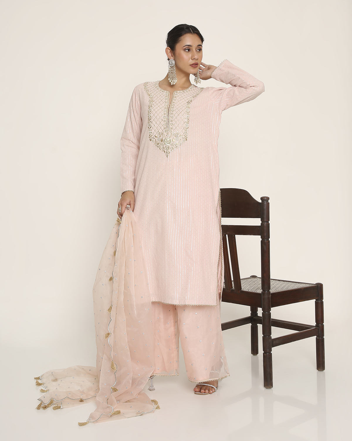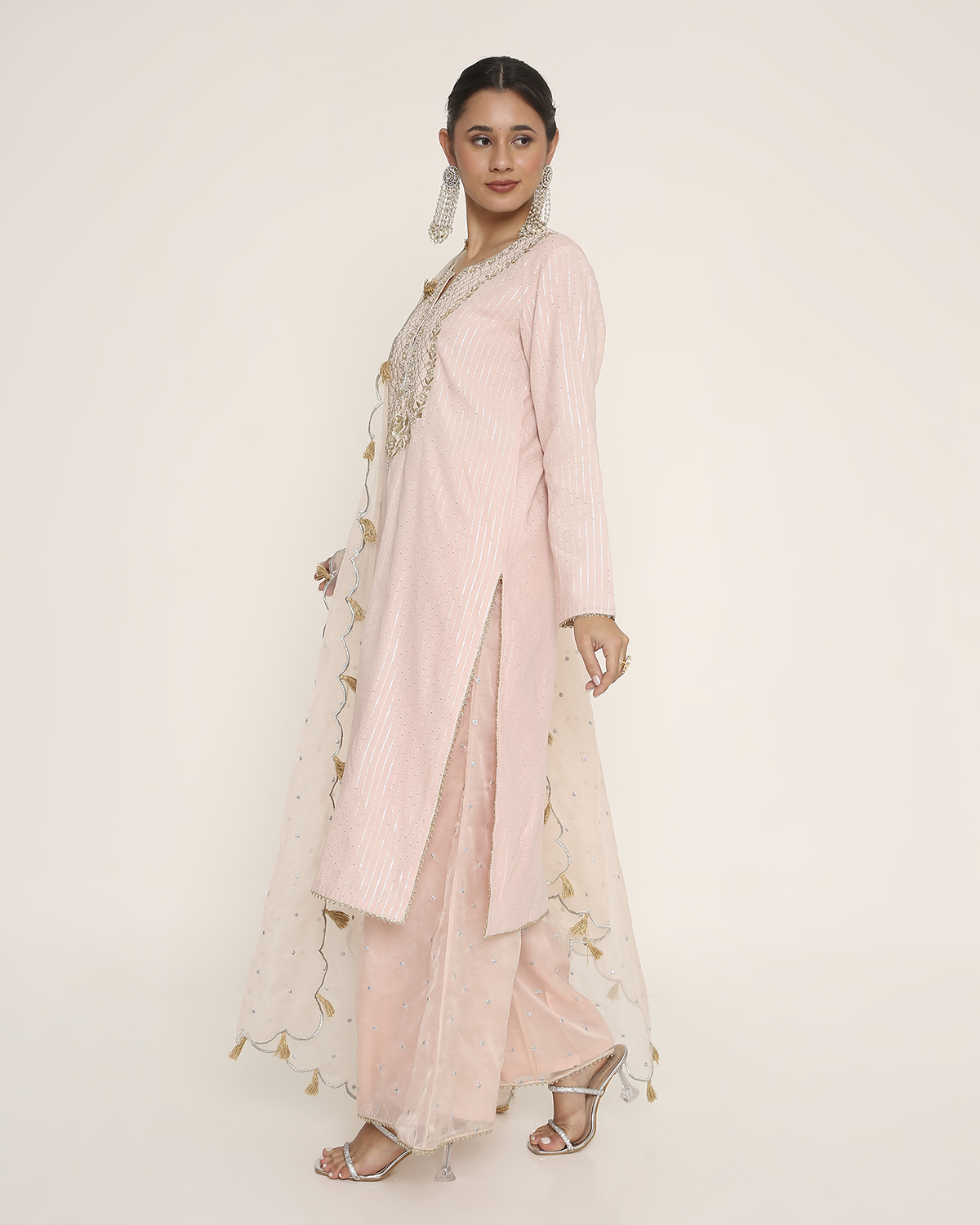 Baby Pink Silver Striped Dola Cotton silk Kurti with Embroidery on the Yoke and Organza Palazzo with Scallop-Embroidered Organza Dupatta