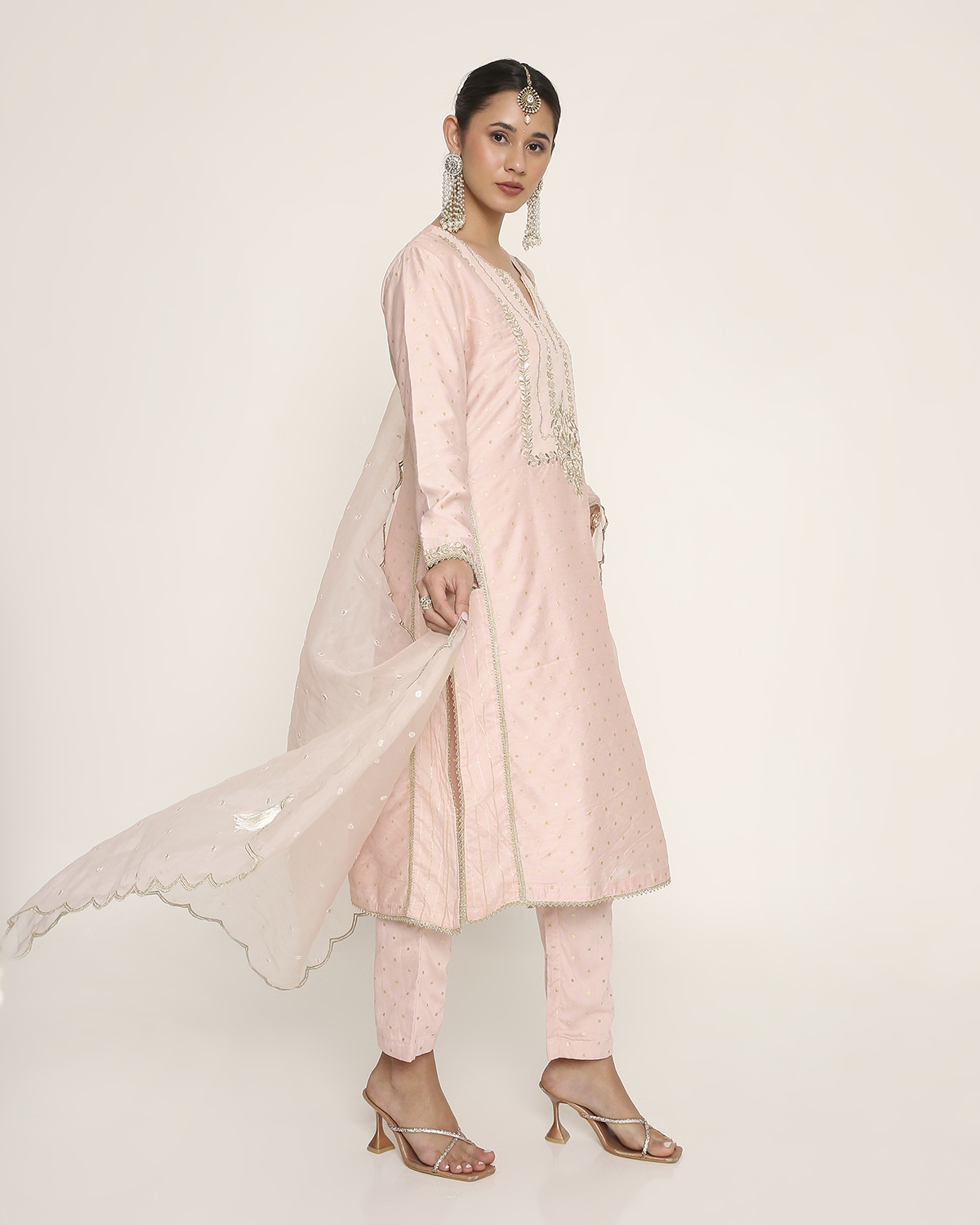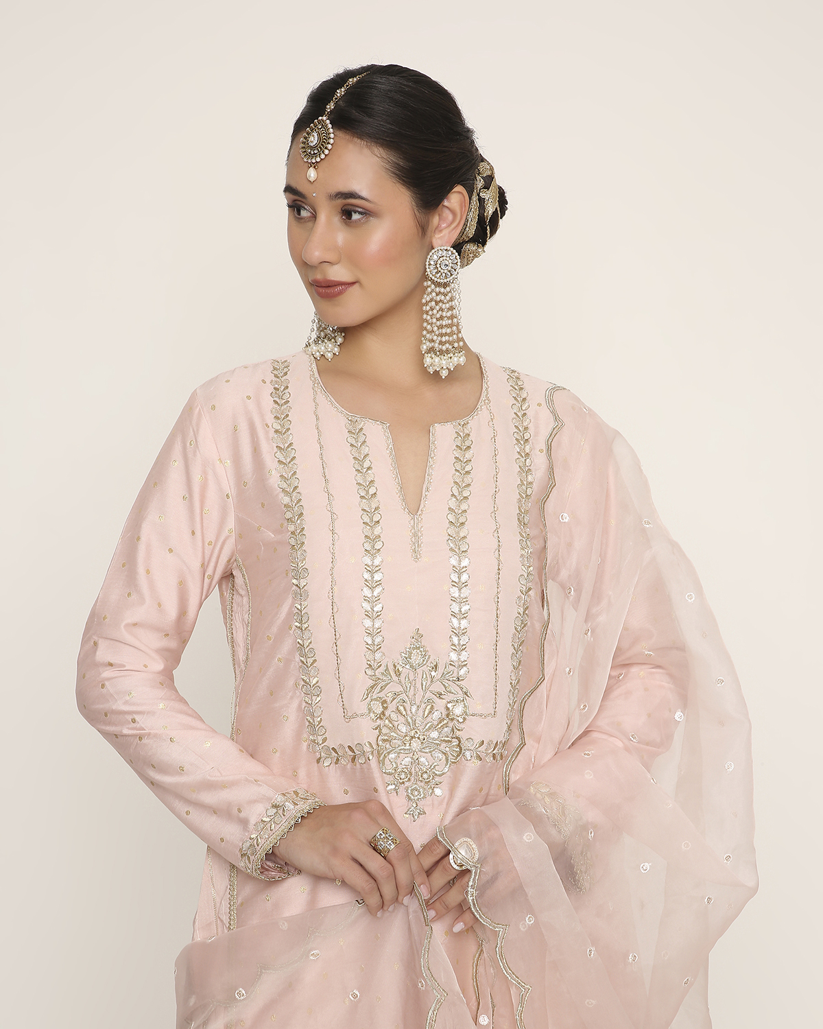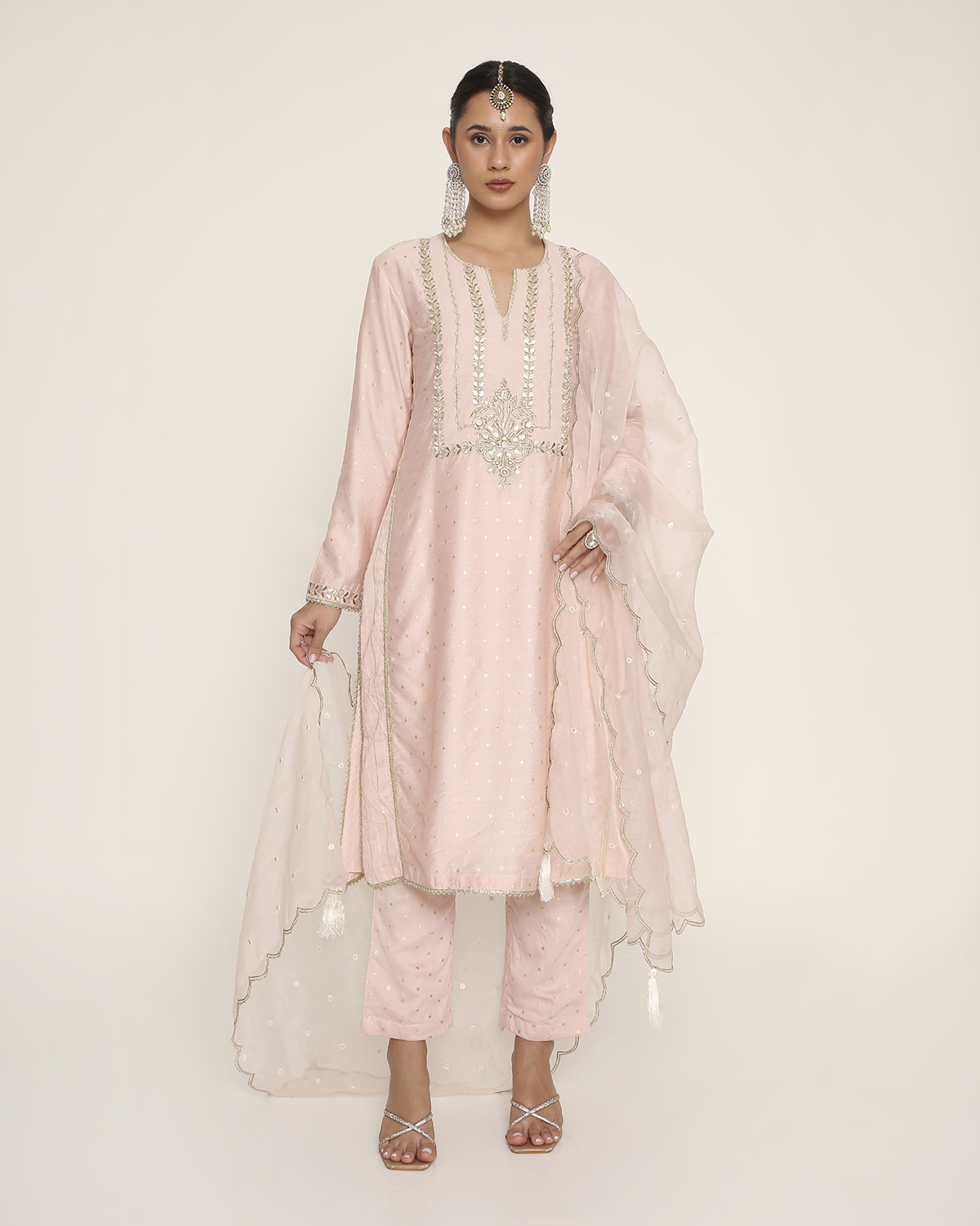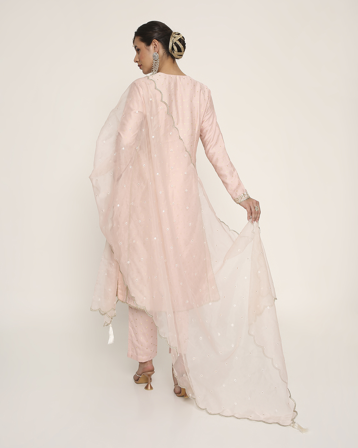 Baby Pink Dola Silk Kurti with Embroidery on Yoke with Pant and Scallop Embroidered Organza Dupatta