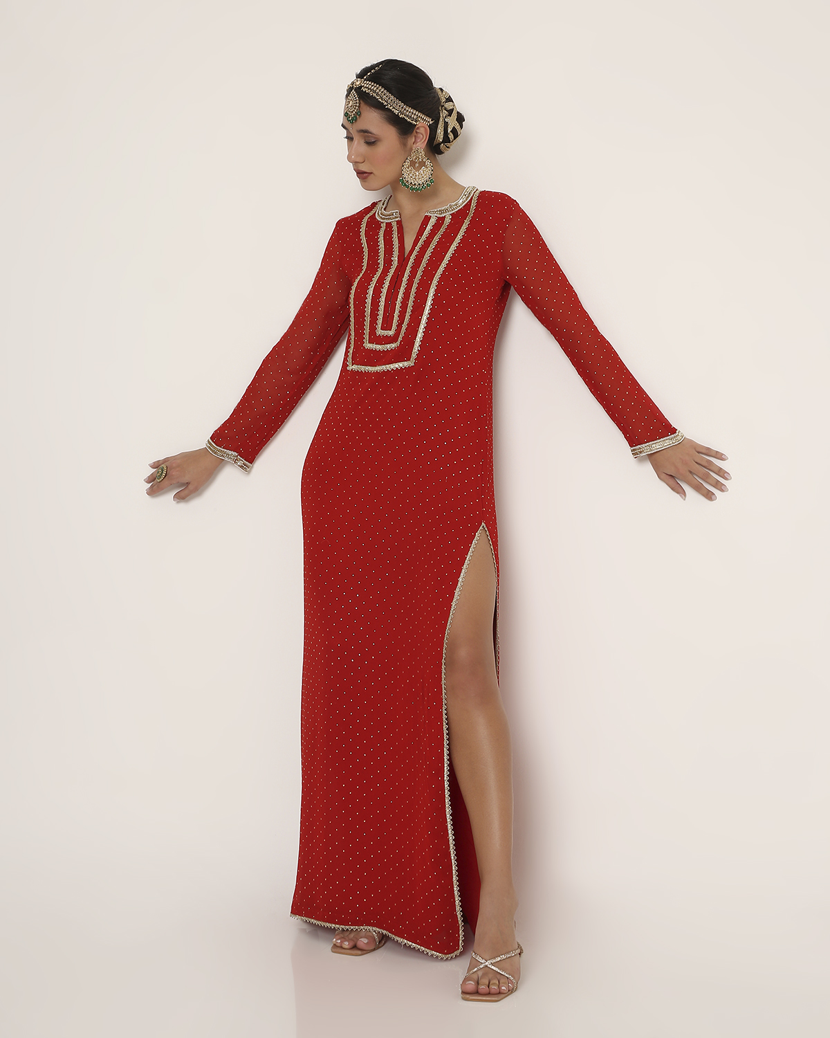 Red Badla Georgette Beyza Kaftan with Embroidery on Collar and Scallop-Embroidered Organza Dupatta