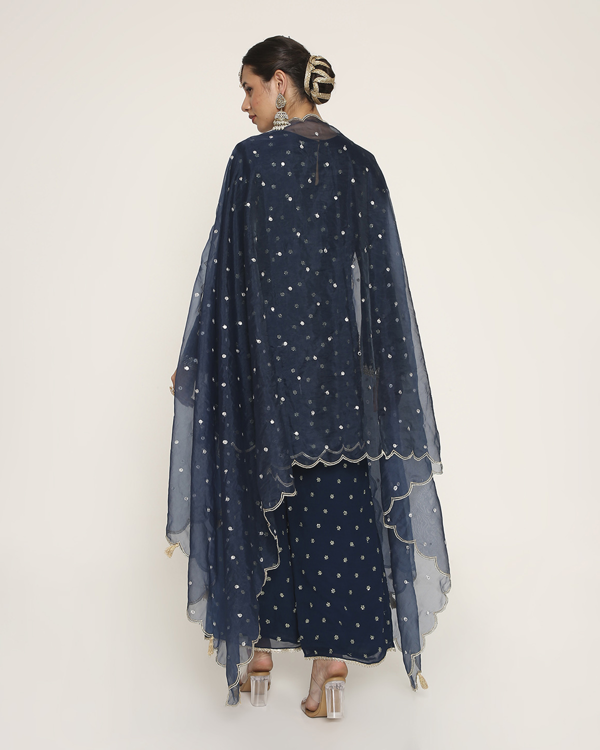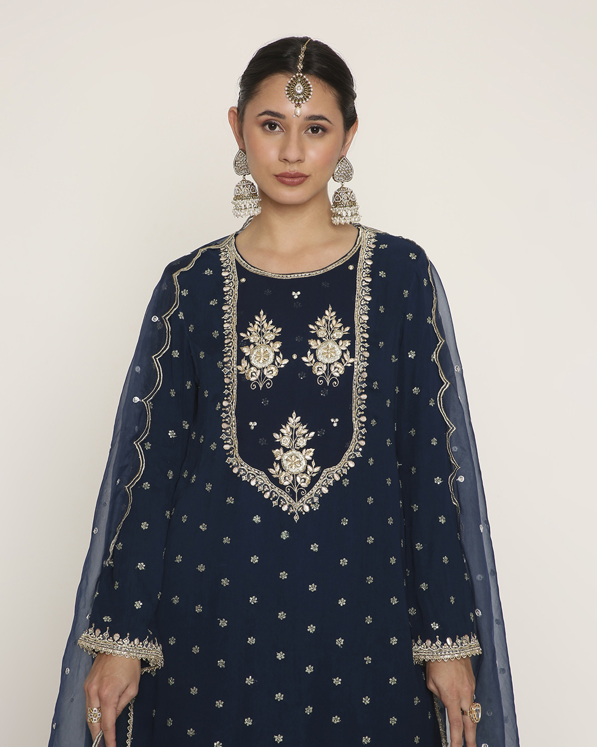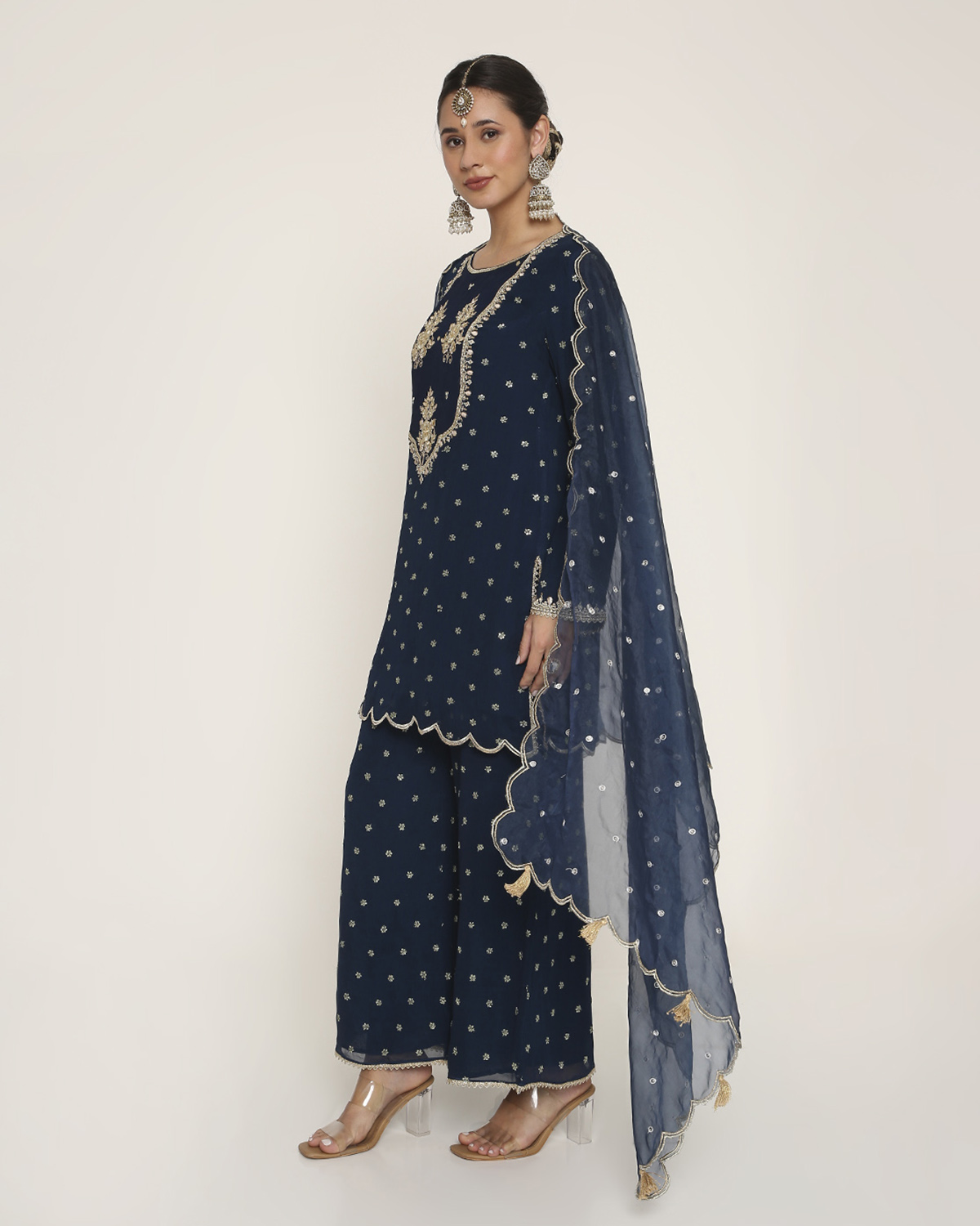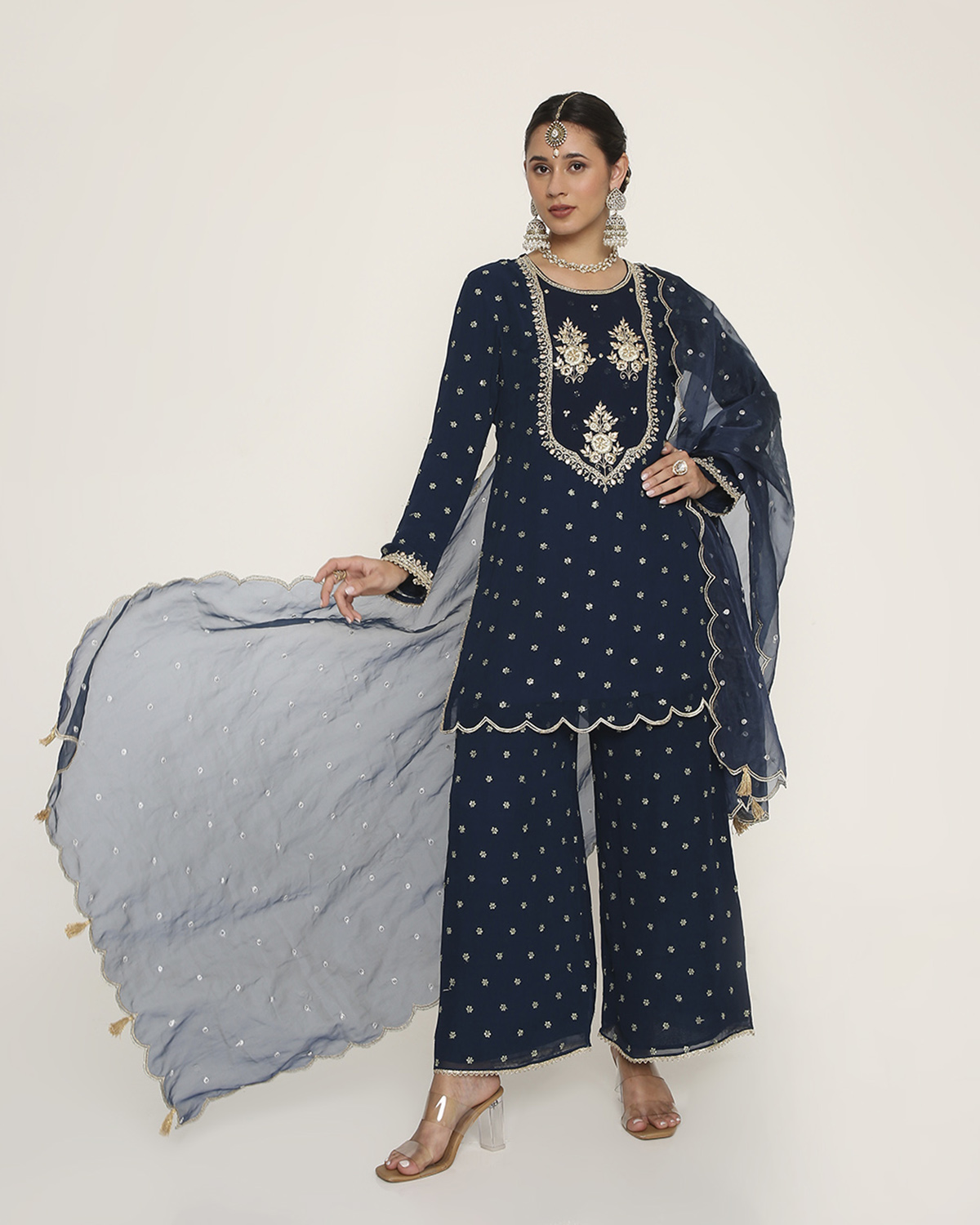 Navy Blue Georgette Kurti with butties all over and Embroidery on the Yoke, with Palazzo, and a Scallop-Embroidered Dupatta