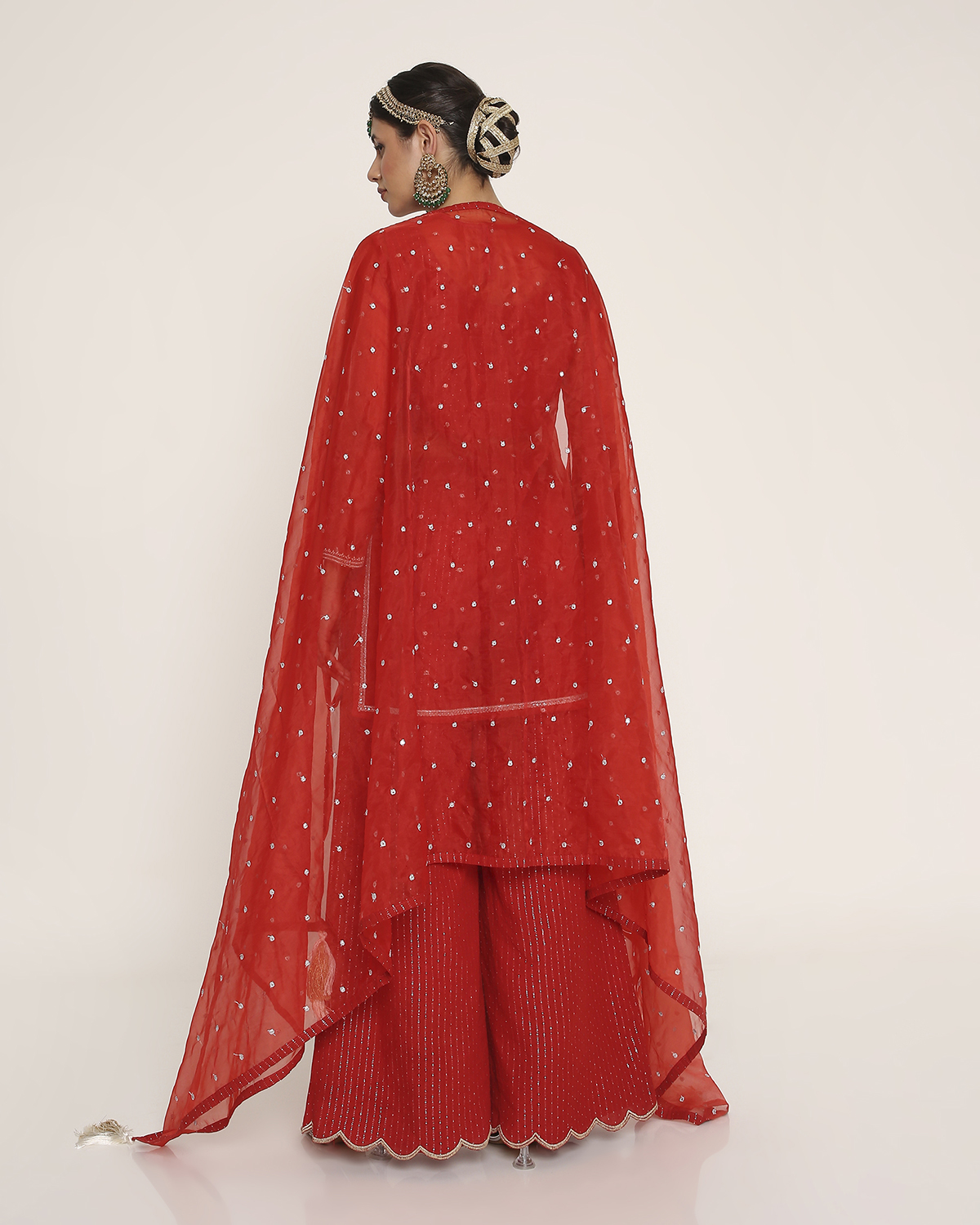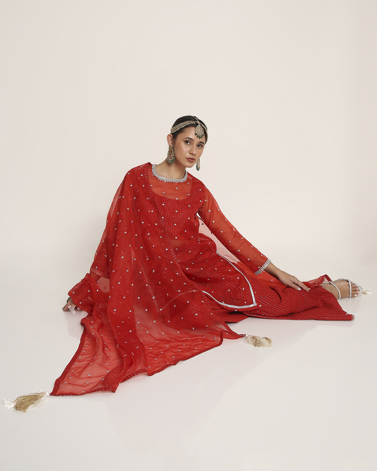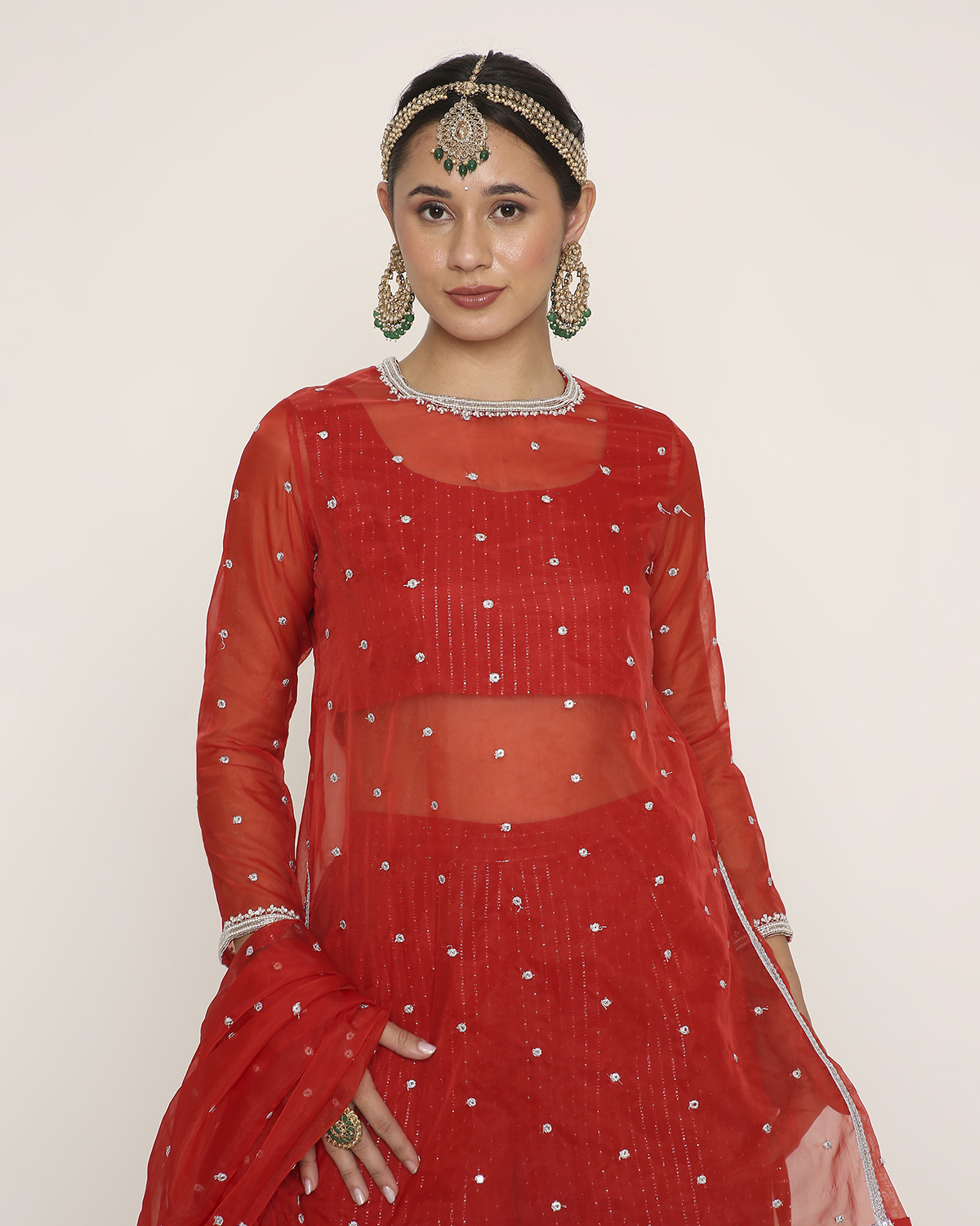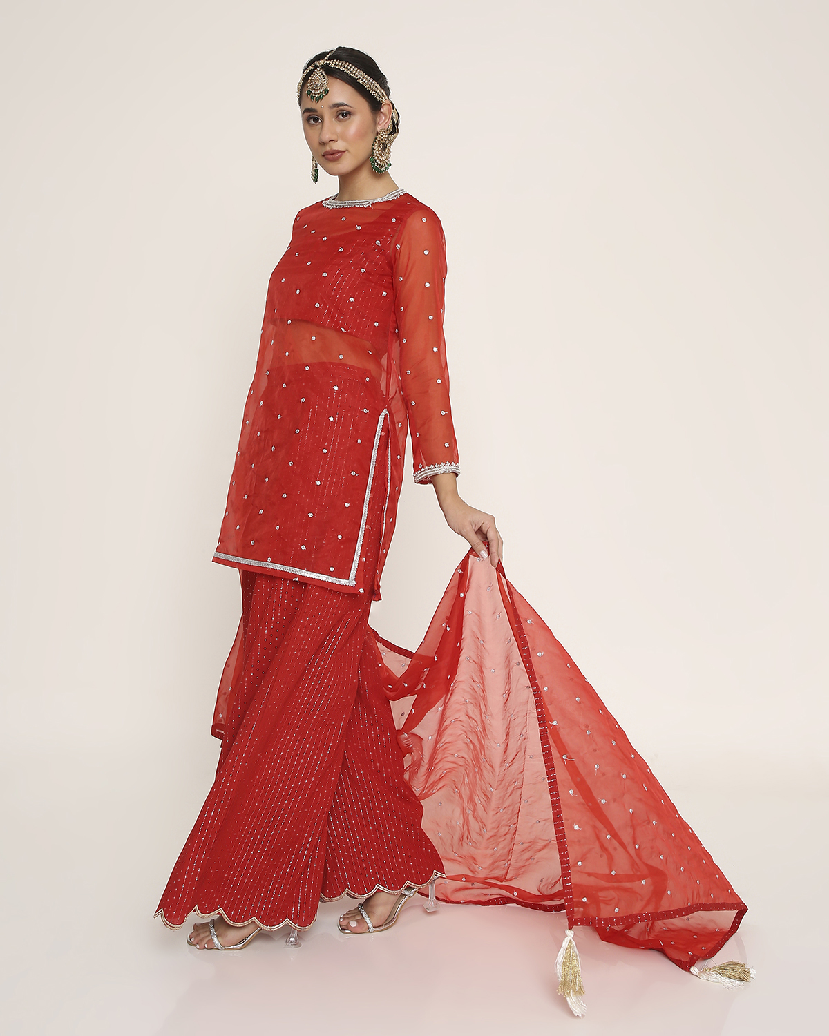 Red Organza Kurti—Embroidery on Collar/Sleeves with Sleeveless Blouse, a Plazzo, and an Organza Dupatta
