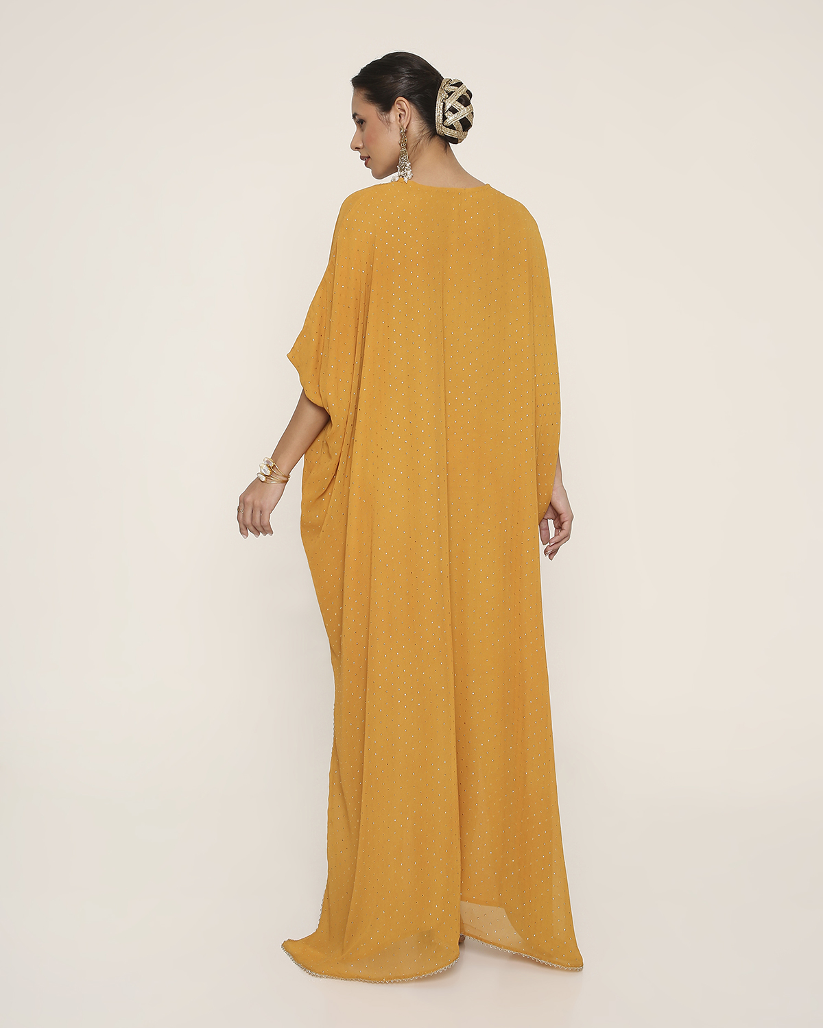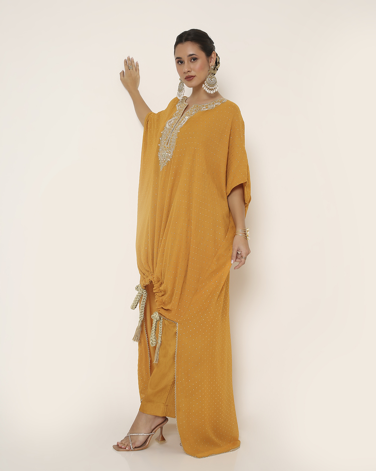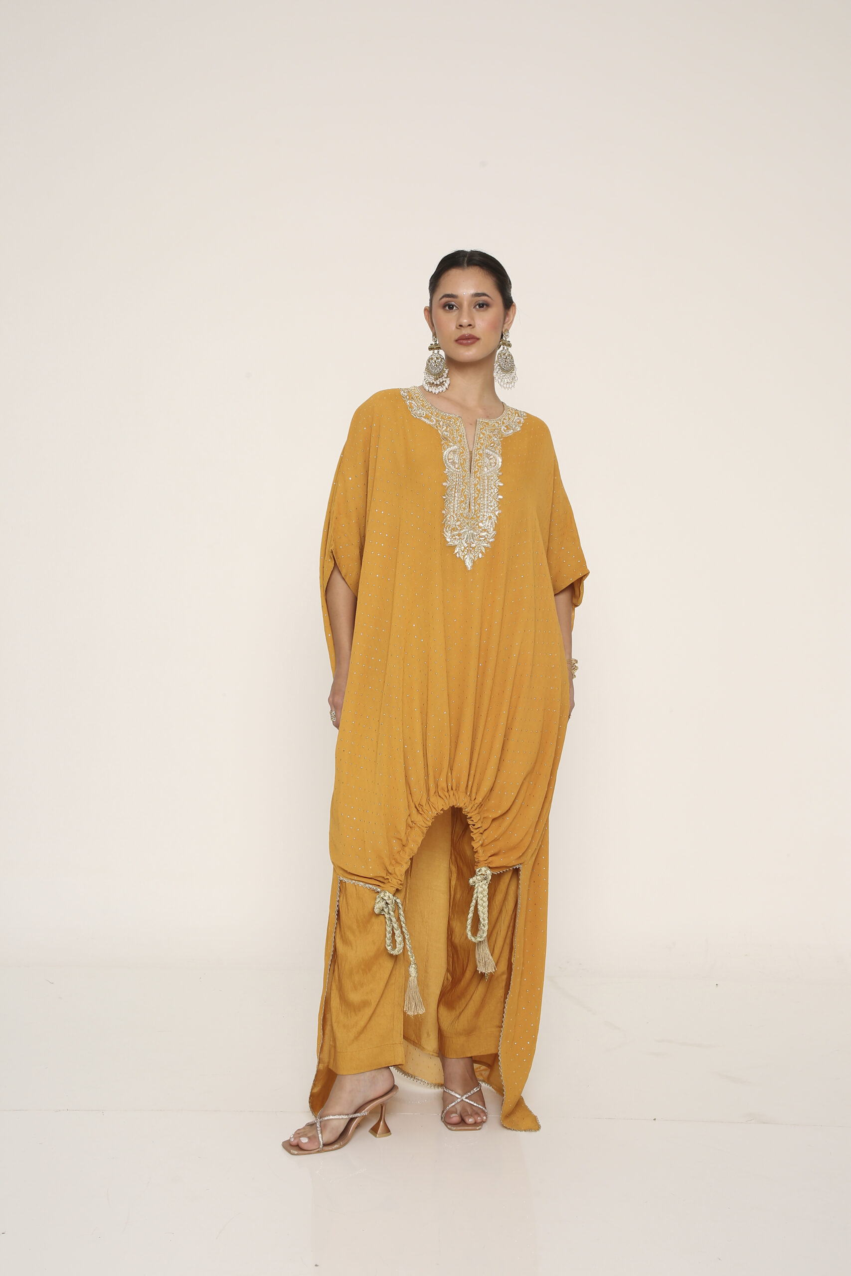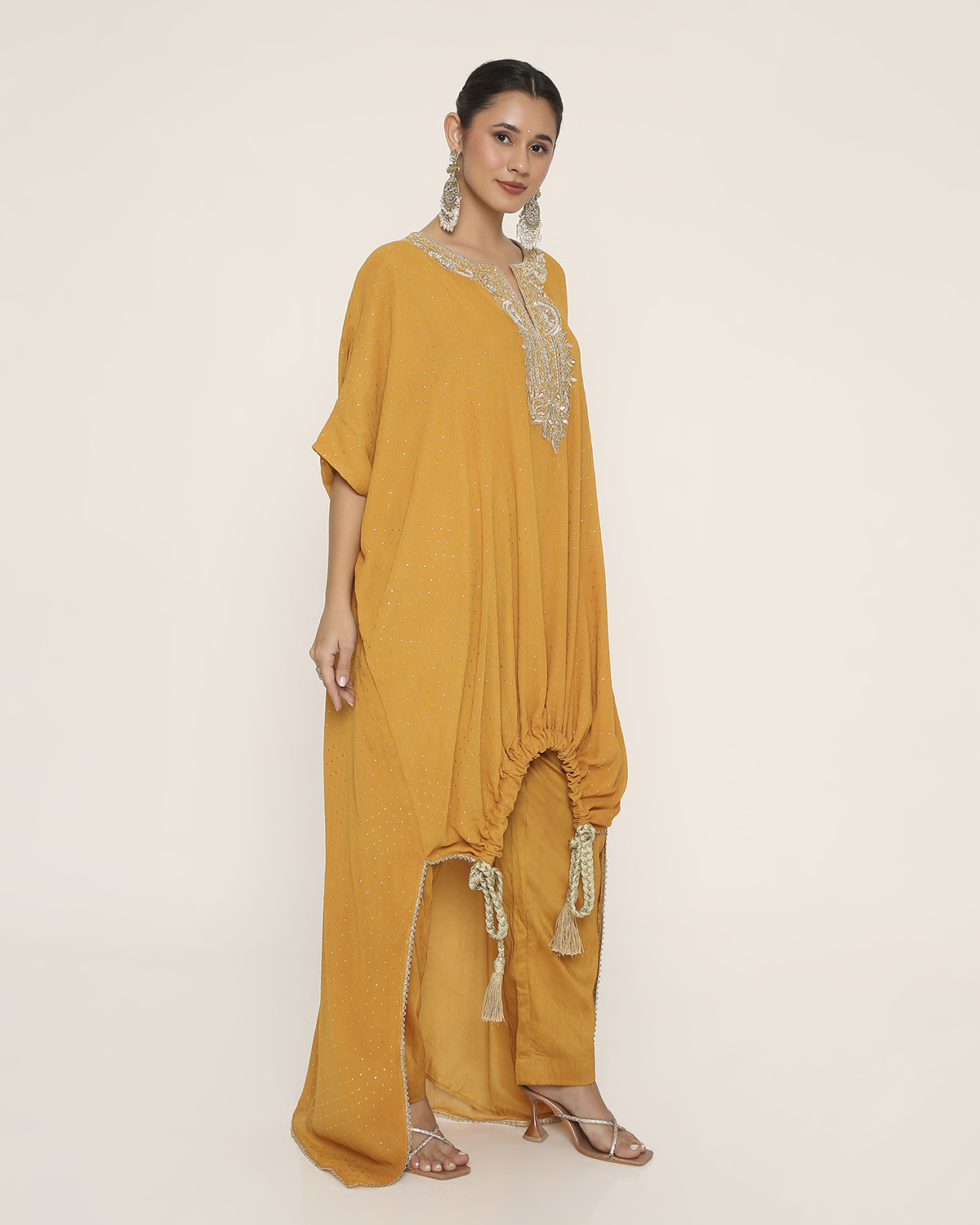 Yellow Badla Georgette High-Low Kaftan Embroidery on Yoke with Cotton Silk Pant